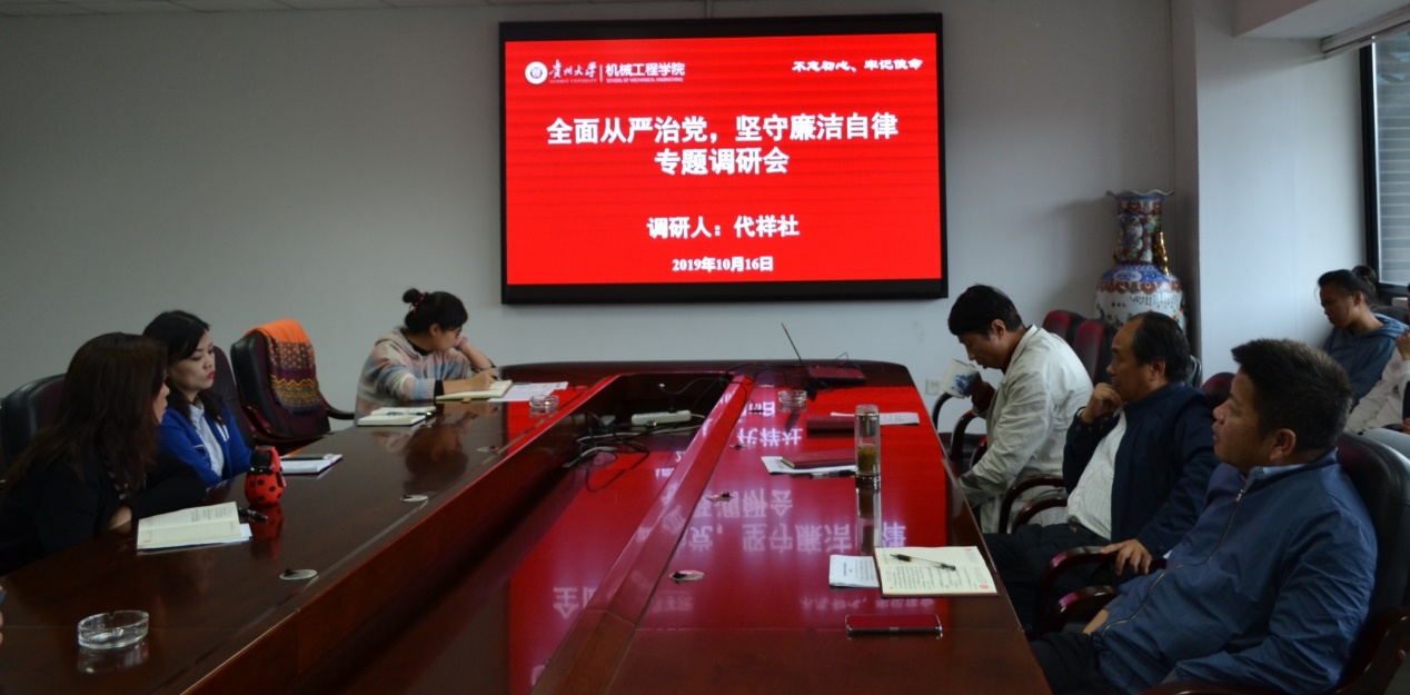 (記者 范順鑫|攝影 范順鑫 )為認(rèn)真落實(shí)中央、省委和貴州大學(xué)黨委的決策部署,扎實(shí)開(kāi)展學(xué)院“不忘初心、牢記使命”主題教育工作,根據(jù)機(jī)械工程學(xué)院黨委班子成員開(kāi)展主題教育調(diào)研方案,10月16日,機(jī)械工程學(xué)院黨委副書(shū)記代祥社在機(jī)械樓518會(huì)議室召開(kāi)“全面從嚴(yán)治黨,堅(jiān)守廉潔自律”專(zhuān)題調(diào)研會(huì),學(xué)院黨委書(shū)記安明剛、副院長(zhǎng)楊勤及各支部書(shū)記、學(xué)生黨員代表、教職工黨員代表參加了會(huì)議。
