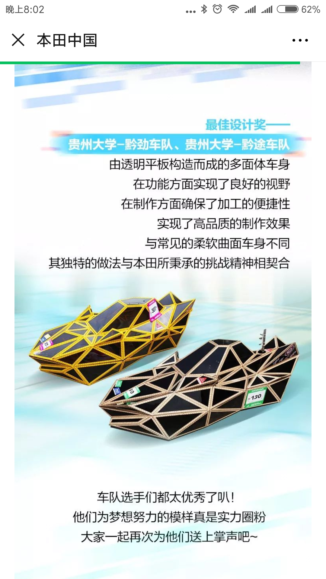 貴州大學(xué)榮獲2019第13屆Honda中國(guó)節(jié)能競(jìng)技大賽雙項(xiàng)最佳設(shè)計(jì)獎(jiǎng)