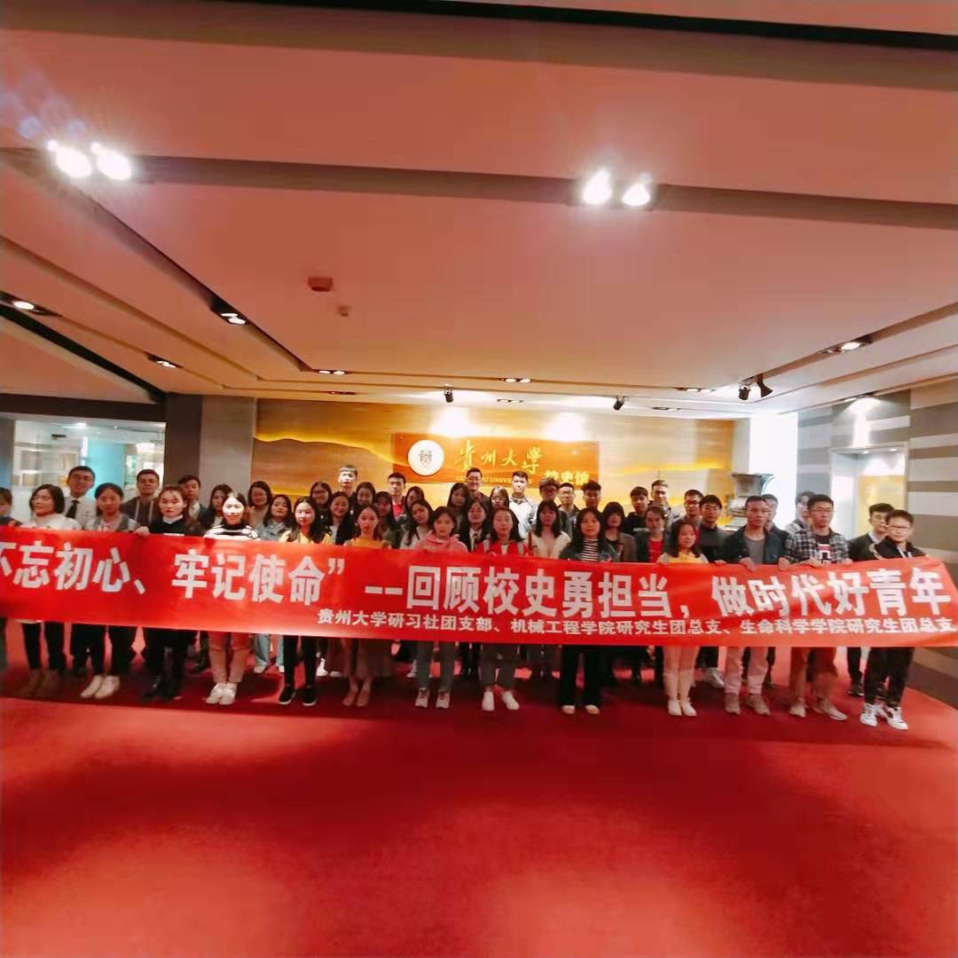 2019114日下午,由貴州大學機械工程學院研究生團總支、生命科學學院研究生團總支以及研習社共同組織策劃的“不忘初心,牢記使命”系列團日活動成功舉行。以“回顧校史勇?lián)?,做時代好青年”為主題,分為主題宣講和參觀校史館兩個部分,在機械學院和生命科學學院獲得了廣泛響應,參加人數(shù)共計80余人。