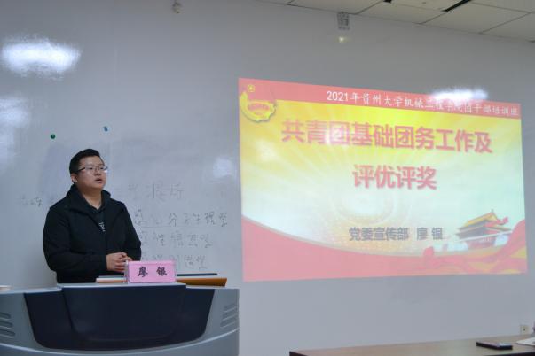機(jī)械工程學(xué)院網(wǎng)站訊(記者 徐馳|攝影 徐馳)4月14日晚七點(diǎn),機(jī)械工程學(xué)院在機(jī)械樓416舉行了團(tuán)干部培訓(xùn)會(huì)。此次培訓(xùn)會(huì)特別邀請(qǐng)了貴州大學(xué)校團(tuán)委組織部部長(zhǎng)廖銀老師擔(dān)任主講老師。培訓(xùn)會(huì)由學(xué)生科何琳煜老師主持,學(xué)院各團(tuán)支部書(shū)記、副書(shū)記、組織委員參加了此次培訓(xùn)。