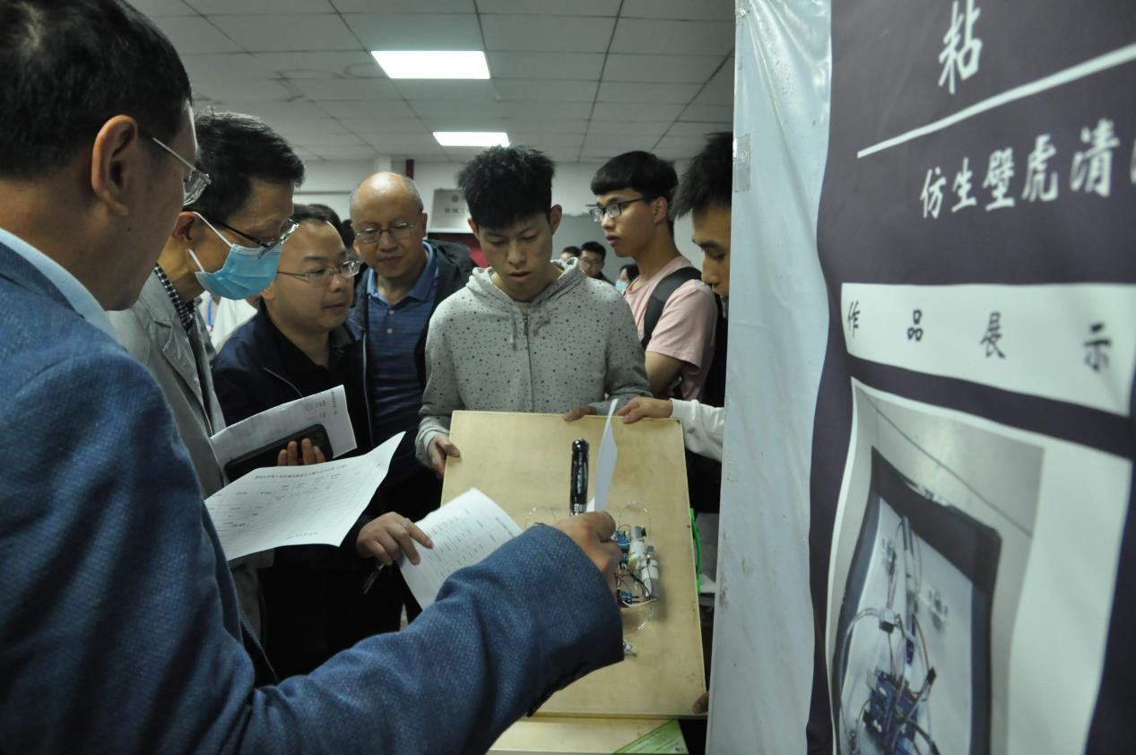 專家評審團(tuán)在機(jī)械工程學(xué)院一樓大廳依次查看各參賽隊伍的作品簡介和實物演示,并進(jìn)行打分。隨后,專家評審團(tuán)進(jìn)行短暫地討論。所有參賽隊伍被分為兩組在機(jī)械樓416和518會議室進(jìn)行現(xiàn)場答辯。各組通過PPT展示作品的設(shè)計思路、設(shè)計方法、主要機(jī)構(gòu)設(shè)計等,評審團(tuán)專家根據(jù)各組現(xiàn)場演示的表現(xiàn)以及PPT展示提出問題,答辯選手進(jìn)行回答。評審團(tuán)的專家們對作品提出改進(jìn)意見和改進(jìn)方向。