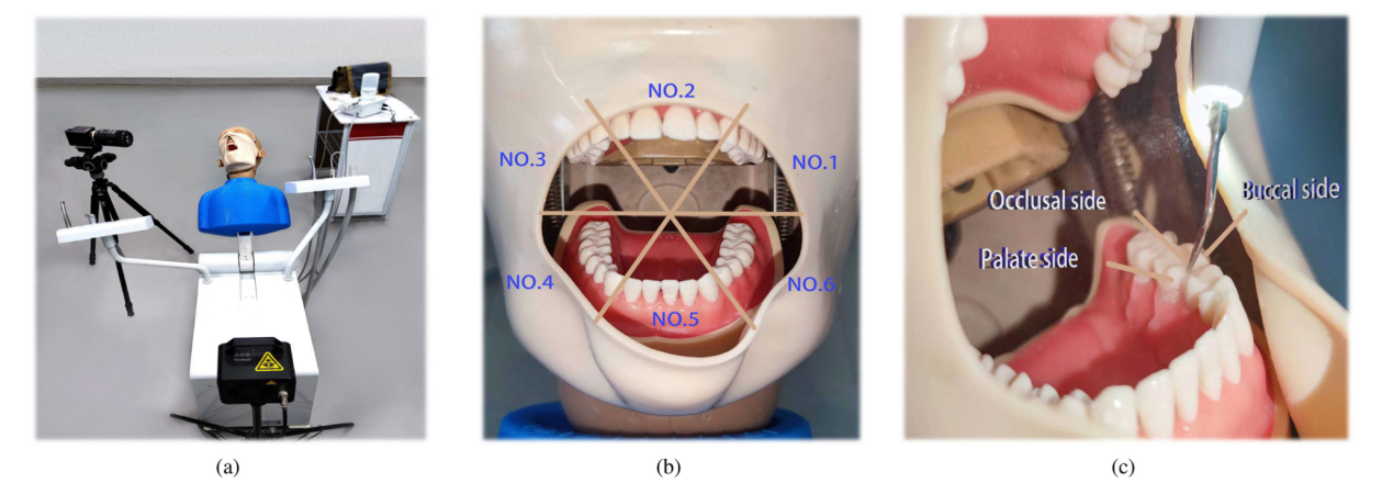 圖 1. (a) 實(shí)驗(yàn)場(chǎng)景示意圖,包括粒子測(cè)速設(shè)備、人體模型和超聲波潔牙機(jī);(b) 口腔牙齒分區(qū)示意圖,其中口腔內(nèi)的牙齒被分為六個(gè)主要區(qū)域;(c) 單顆牙齒分區(qū)示意圖,其中每顆牙齒被分為三個(gè)表面。(c) 單顆牙齒的分區(qū)圖,其中每顆牙齒分為三個(gè)表面、腭面、頰面和咬合面;
