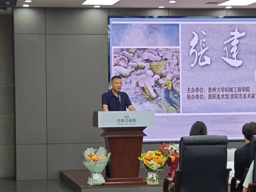 貴州大學(xué)機械工程學(xué)院院長趙津致辭中介紹了畫展情況、貴州大學(xué)機械工程學(xué)院和工業(yè)設(shè)計專業(yè)的情況以及張建敏老師的藝術(shù)成就。認(rèn)為此次畫展是對工程類專業(yè)學(xué)生開展美育的一個積極實踐。