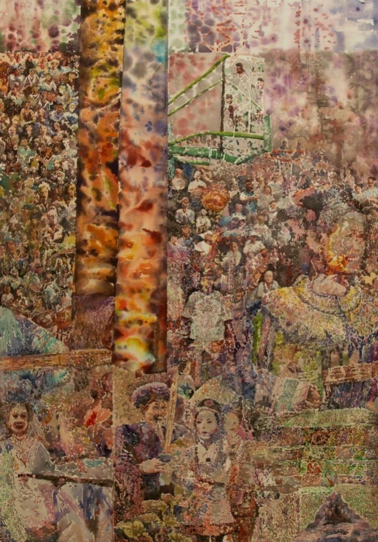 2022年,貴州省黔東南州臺盤鄉(xiāng)臺盤村舉辦貴州省“美麗鄉(xiāng)村”籃球聯(lián)賽?;鸨W(wǎng),被稱之為“村BA”?!按?/span>BA”由“六月六”吃新節(jié)籃球賽演變而來,已有百年歷史。畫面上方描繪了密密麻麻的觀眾,左中下方為幾個表演反排木鼓舞的村民,中間為一個籃球架和打籃球的選手,右方是一個微笑著表演侗家琵琶音的姑娘。畫面用斑斕的色彩表現(xiàn)了多彩貴州豐富燦爛的民族文化,也表達(dá)了作者希望傳統(tǒng)民族文化在新時代煥發(fā)出新的生機活力,綻放出更加迷人的光彩的愿望。