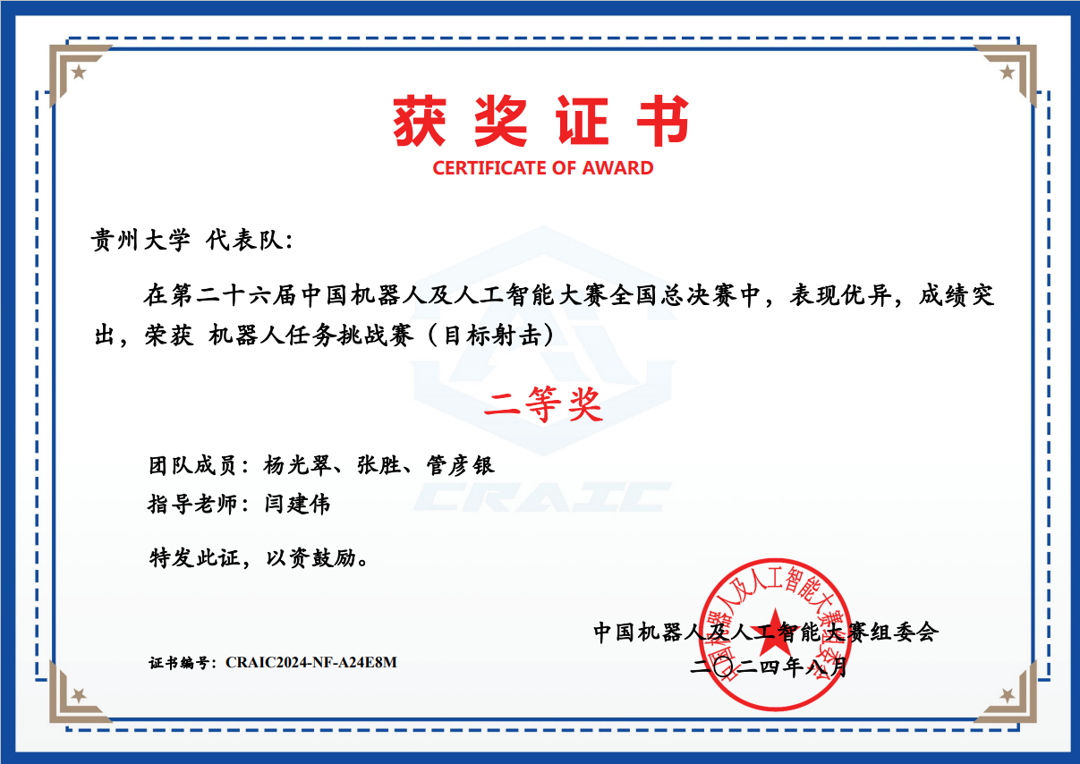 2 | 機(jī)器人任務(wù)挑戰(zhàn)賽(目標(biāo)射擊) | CRAIC20241AYRR5JB | 張少俠、蒙超、王占坤 | 全國(guó)一等獎(jiǎng) |