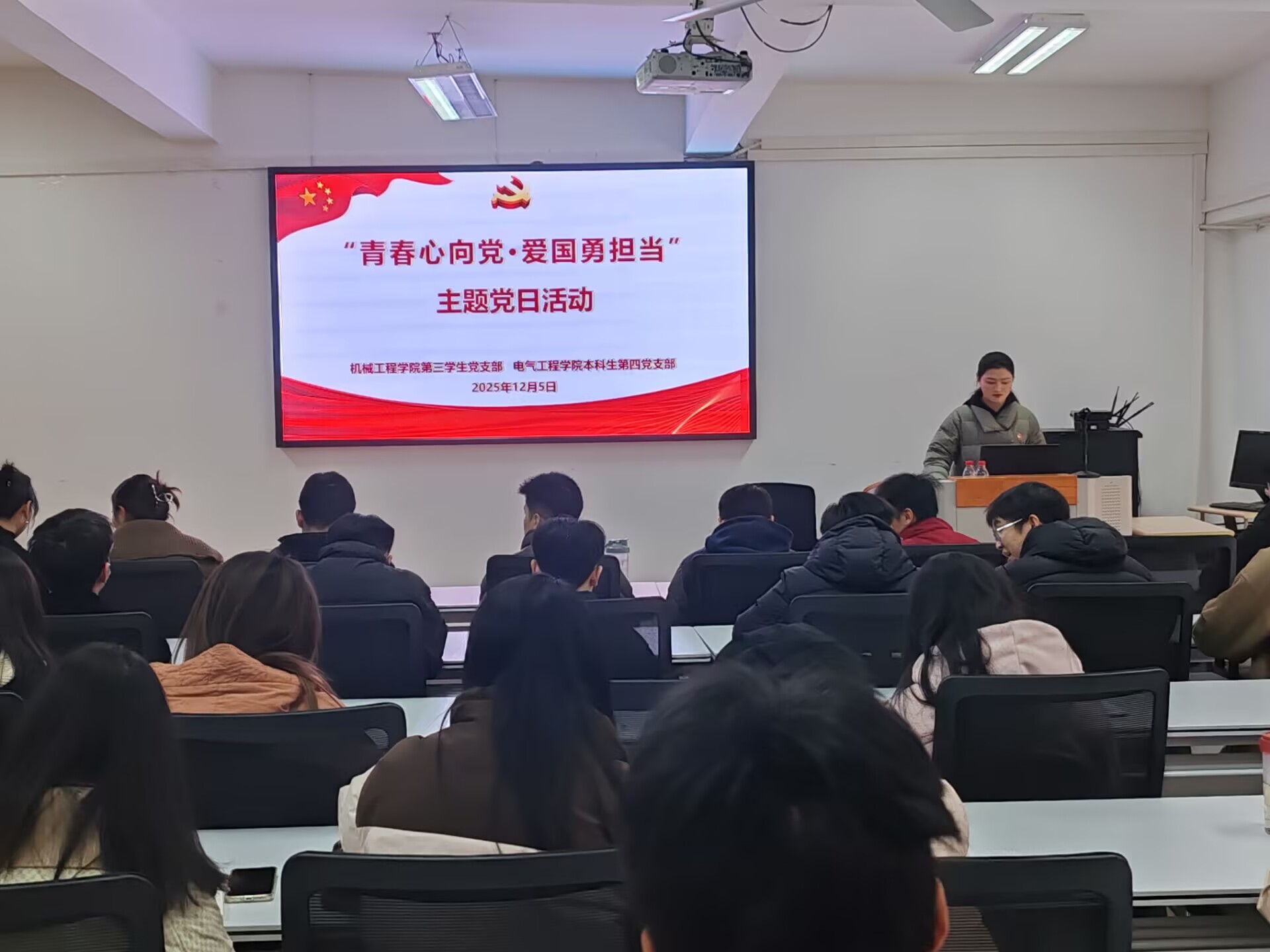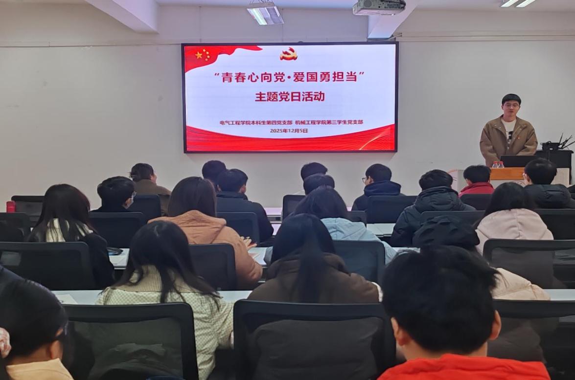 為厚植家國(guó)情懷,強(qiáng)化責(zé)任擔(dān)當(dāng),切實(shí)將愛國(guó)情、強(qiáng)國(guó)志、報(bào)國(guó)行融入學(xué)習(xí)工作實(shí)踐,2025年12月5日,機(jī)械工程學(xué)院本科生第三黨支部聯(lián)合電氣工程學(xué)院本科生第四黨支部在機(jī)械樓327開展“青春心向黨·愛國(guó)勇?lián)?dāng)”主題黨日活動(dòng)?;顒?dòng)通過學(xué)習(xí)理論知識(shí)、“榜樣之光”故事分享、觀看短片、集體合唱、交流研討形式進(jìn)行,活動(dòng)由機(jī)械工程學(xué)院本科生第三黨支部支部書記趙麗芳老師主持。