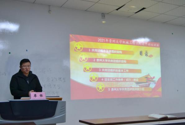 機(jī)械工程學(xué)院網(wǎng)站訊(記者 徐馳|攝影 徐馳)4月14日晚七點(diǎn),機(jī)械工程學(xué)院在機(jī)械樓416舉行了團(tuán)干部培訓(xùn)會(huì)。此次培訓(xùn)會(huì)特別邀請(qǐng)了貴州大學(xué)校團(tuán)委組織部部長(zhǎng)廖銀老師擔(dān)任主講老師。培訓(xùn)會(huì)由學(xué)生科何琳煜老師主持,學(xué)院各團(tuán)支部書(shū)記、副書(shū)記、組織委員參加了此次培訓(xùn)。
