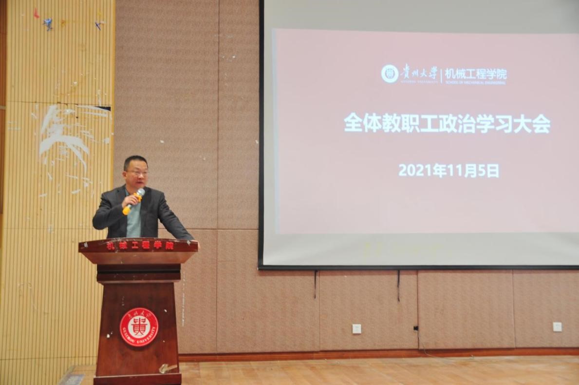 機械工程網(wǎng)站訊(記者 胡佳|攝影 胡佳)2021年11月 5日,機械工程學(xué)院于機械樓圓形報告廳召開教職工政治理論學(xué)習(xí)大會,學(xué)院黨委書記安明剛、副院長何鋒、楊勤出席會議,全院教職工參加會議。會議由安明剛主持。