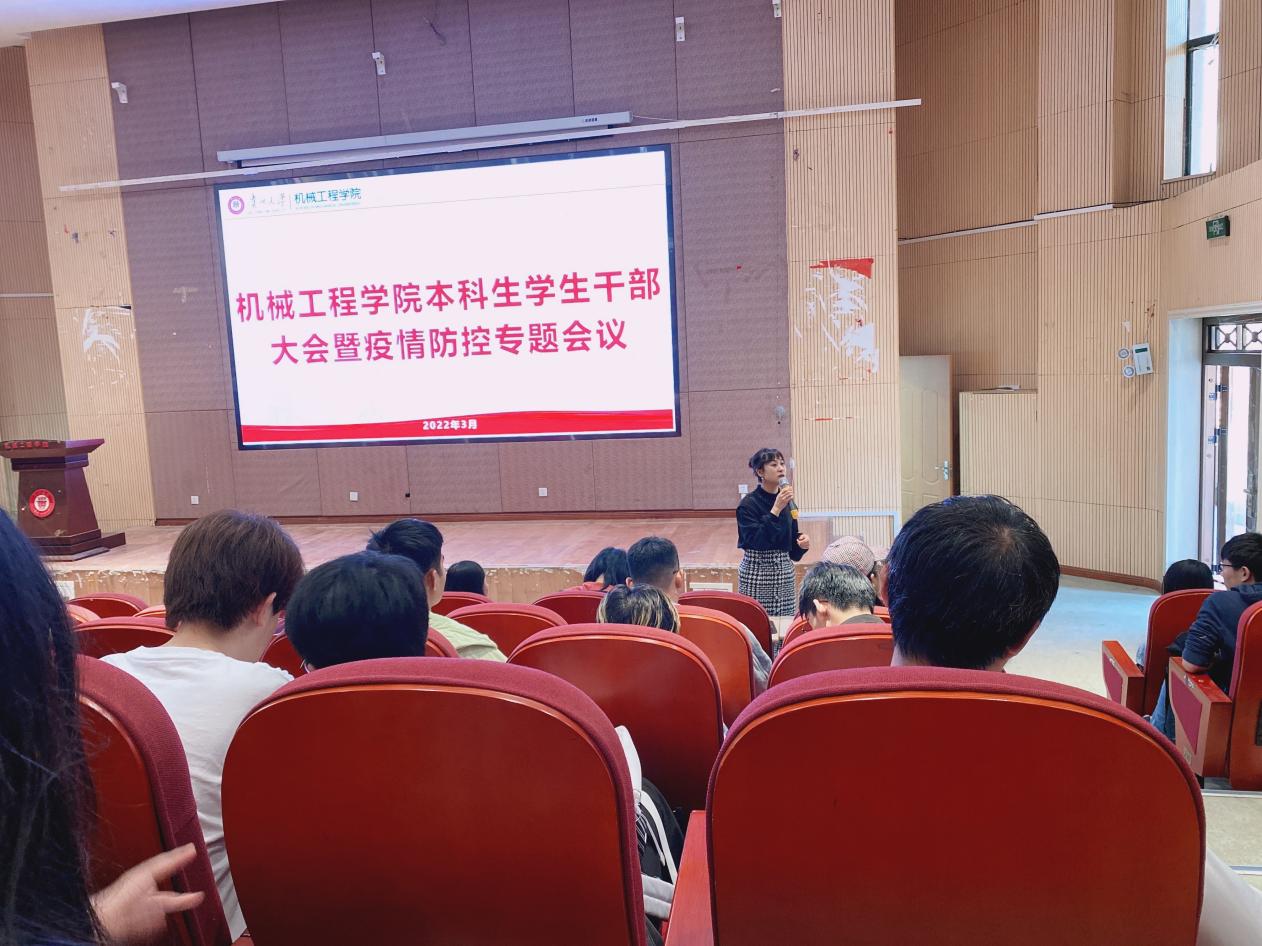 機(jī)械工程網(wǎng)站訊(記者 徐馳|攝影 鄧子航 楊麗)為更好的開展疫情防控工作和學(xué)生日常工作,機(jī)械工程學(xué)院于2022年3月18日在機(jī)械樓圓形報(bào)告廳召開了本科生學(xué)生干部暨疫情防控專題會(huì)議。機(jī)械工程學(xué)院黨委副書記廖燁出席會(huì)議,學(xué)生科老師何琳煜、趙麗芳、聶虹以及機(jī)械工程學(xué)院全體學(xué)生干部參加會(huì)議。