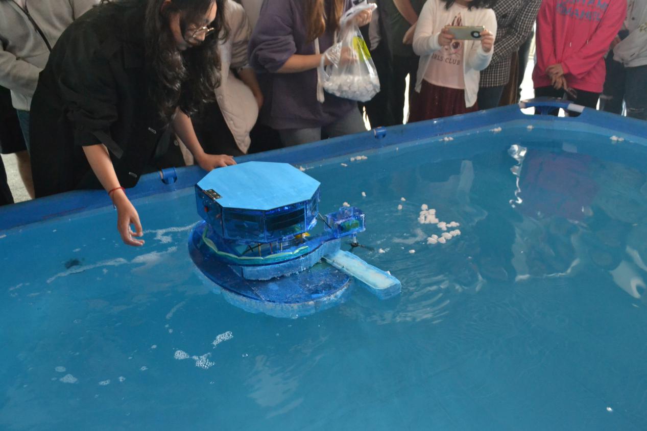 比賽現(xiàn)場人聲鼎沸,有活靈活現(xiàn)的仿生機(jī)械,也有生態(tài)修護(hù)、保護(hù)環(huán)境類的機(jī)械作品。參賽隊伍們各顯神通,向評審專家團(tuán)以及在場的老師同學(xué)們展示他們的設(shè)計成果?!疤窳?!”仿生機(jī)械“助力漁”一下水便引起了現(xiàn)場的驚嘆,他們的作品就像一條活生生的魚在水中游來游去。生態(tài)修復(fù)類別的垃圾處理機(jī)器人在水下順利完成垃圾抓取,得到了現(xiàn)場熱烈的掌聲。