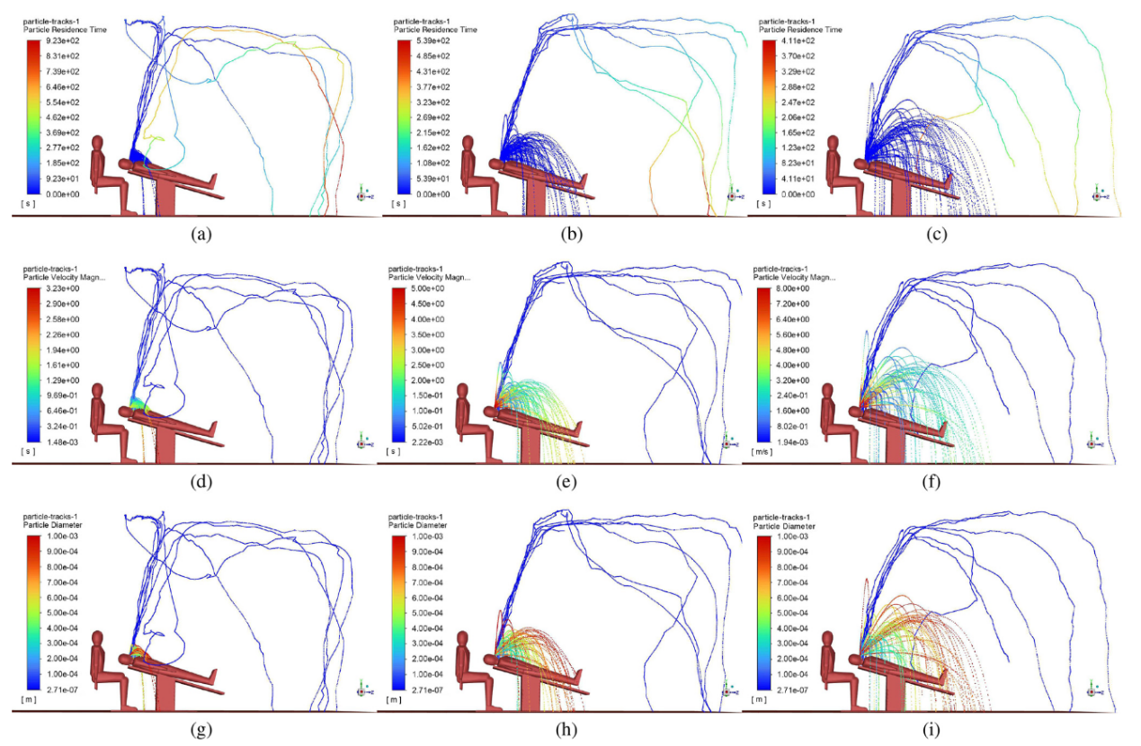 圖 3. 案例 7-9 分別模擬了在大初始噴射角下使用低、中、高功率引發(fā)的液滴流動(dòng)。(a)-(c) 液滴顆粒在空氣中的停留時(shí)間;(d)-(f) 不同粒徑的液滴顆粒在空氣中的停留時(shí)間;(d)-(f) 不同粒徑液滴顆粒的速度分布;(g)-(i) 液滴顆粒的粒徑分布;