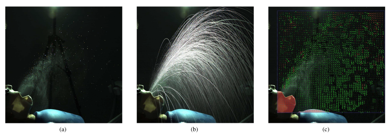 圖 4. 案例 7-9 分別模擬了在大初始噴射角下使用低、中、高功率引發(fā)的液滴流動(dòng)。(a) 液滴的初始噴射速度為 2 米/秒、液滴的初始噴射角為 90;(b)液滴的初始噴射速度為 5m/s,液滴的初始噴射角為 90;以及(c)液滴的初始噴射速度為 8m/s,液滴的初始噴射角為 90。液滴的初始噴射角為 90;