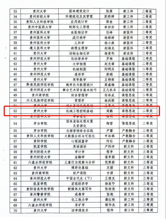 多年來,周鵬老師努力提升教育教學(xué)水平,開展教學(xué)改革研究,主持省級(jí)教改項(xiàng)目1項(xiàng),獲第三屆貴州大學(xué)教師教學(xué)創(chuàng)新大賽課程思政組校級(jí)三等獎(jiǎng)1項(xiàng),貴州大學(xué)青年教師教學(xué)競(jìng)賽新工科組校級(jí)三等獎(jiǎng)1項(xiàng),第4屆高校教師教學(xué)創(chuàng)新大賽課程思政組校級(jí)一等獎(jiǎng)1項(xiàng),參與建設(shè)2022年度省級(jí)“金課”1項(xiàng)(排名第2)。2016、2017年連續(xù)兩次獲評(píng)研究生入學(xué)教育先進(jìn)個(gè)人,獲評(píng)2019年度貴州大學(xué)優(yōu)秀本科生導(dǎo)師、2019年貴州大學(xué)機(jī)械工程學(xué)院學(xué)科競(jìng)賽優(yōu)秀指導(dǎo)老師,2023年度機(jī)械工程學(xué)院教育教學(xué)優(yōu)秀個(gè)人。參與國(guó)家一流本科專業(yè)“機(jī)械設(shè)計(jì)制造及其自動(dòng)化”建設(shè),并在該專業(yè)工程教育認(rèn)證工作中承擔(dān)重要任務(wù)。