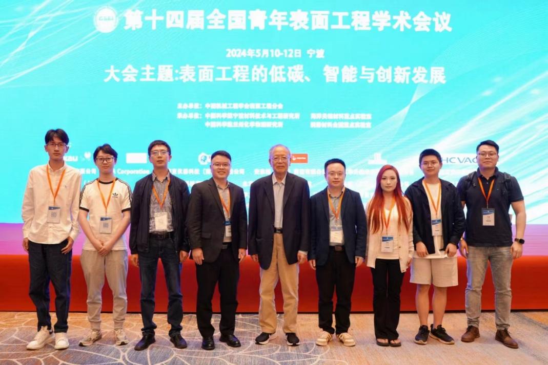 大會(huì)主題是“表面工程的低碳、智能與創(chuàng)新發(fā)展”。機(jī)械工程學(xué)院功能表面團(tuán)隊(duì)唐正強(qiáng)副院長(zhǎng)、彭毅教授、杜昊副教授、楊綠副教授參加了此次會(huì)議,團(tuán)隊(duì)多名學(xué)生也參加會(huì)議并匯報(bào)了研究工作。機(jī)械工程學(xué)院功能表面團(tuán)隊(duì)師生在此次會(huì)議中有2個(gè)特邀報(bào)告、2個(gè)分會(huì)場(chǎng)主持人、2個(gè)口頭報(bào)告和1張海報(bào)展示。其中,唐正強(qiáng)教授作《仿生超親水及水下超疏油表面制備》特邀報(bào)告,杜昊副教授作《AlCrTiNb多元合金靶HiPIMS放電等離子體特性及其氮化物薄膜晶體結(jié)構(gòu)和力學(xué)性能研究》特邀報(bào)告,楊綠副教授作《PdNPs潤(rùn)滑添加劑催化構(gòu)筑碳基摩擦膜及其對(duì)DLC薄膜石墨化磨損的減磨機(jī)制》口頭報(bào)告,團(tuán)隊(duì)在讀碩士研究生李婷作《超疏水功能材料的應(yīng)用》口頭報(bào)告,相關(guān)報(bào)告展示了團(tuán)隊(duì)師生近年來(lái)在摩擦學(xué)和表面工程領(lǐng)域的最新研究進(jìn)展。師生們?cè)跁?huì)場(chǎng)認(rèn)真聆聽(tīng),充分交流,并有幸與薛群基院士合影,得到薛院士的鼓勵(lì)。