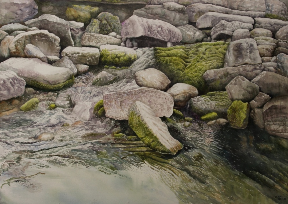 《溪流》畫面為靠近滕龍灣附近的花溪河,2021 第六屆水景繪畫在線大賽(美國)榮譽獎;2021年度(秋季)馬來西亞國際藝術(shù)網(wǎng)絡(luò)大賽《風(fēng)景類》精彩作品。