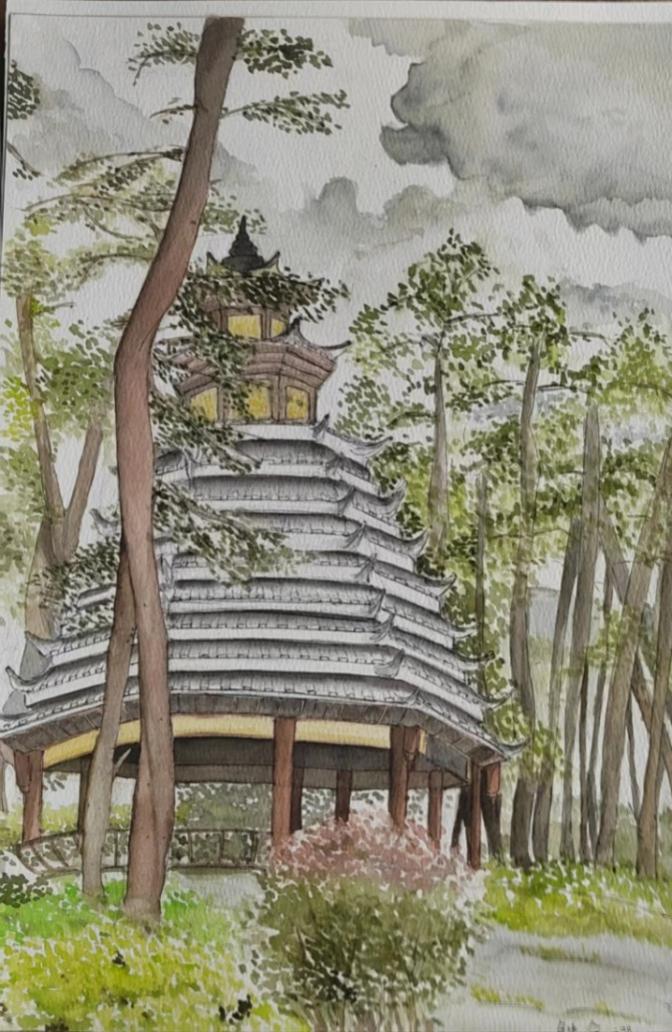 這幅作品取地貴州大學(xué)育賢廣場寫生,畫面中心是位于廣場中心的侗寨鼓樓。其獨特風(fēng)格體現(xiàn)了中國傳統(tǒng)建筑的魅力。周圍環(huán)繞著郁郁蔥蔥的綠色植被和樹木,為整個場景增添了生機與活力。天空中密布的云為畫面增添了一種神秘而寧靜的氛圍,與地面的建筑和植被形成鮮明對比,進一步凸顯了自然與人文的和諧共存。整個畫面色彩柔和,構(gòu)圖和諧,展現(xiàn)了一種平和與自然之美的感覺。