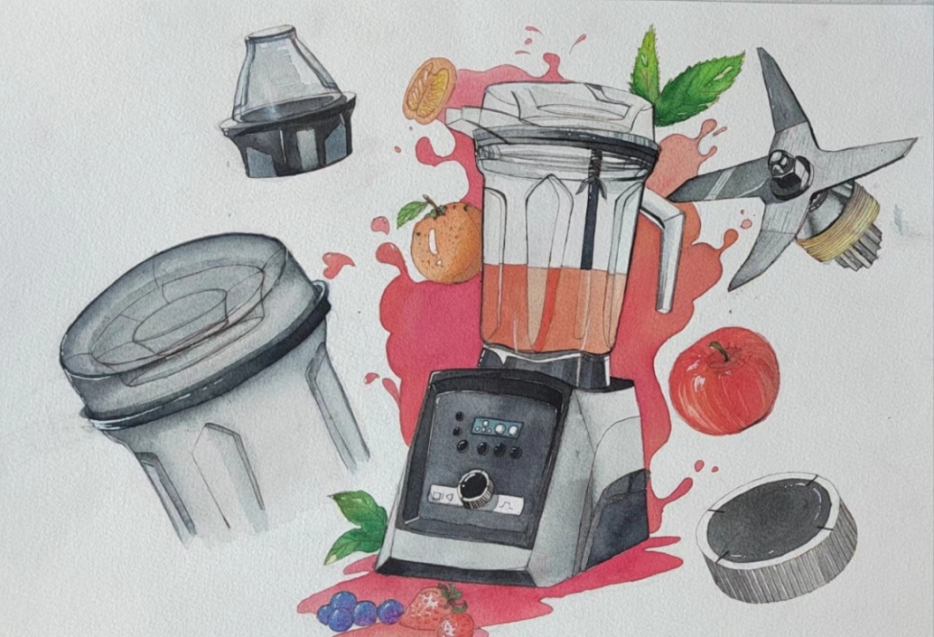 這張圖片展示了一臺水彩畫風(fēng)格的榨汁機。主體色調(diào)通透,給人一種清新自然而又現(xiàn)代的感覺。內(nèi)部放著顏色鮮艷的小番茄,增添了畫面的色彩對比,使畫面充滿生機和活力。