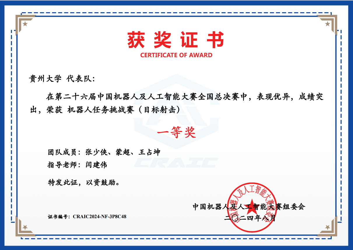 2 | 機(jī)器人任務(wù)挑戰(zhàn)賽(目標(biāo)射擊) | CRAIC20241AYRR5JB | 張少俠、蒙超、王占坤 | 全國(guó)一等獎(jiǎng) |