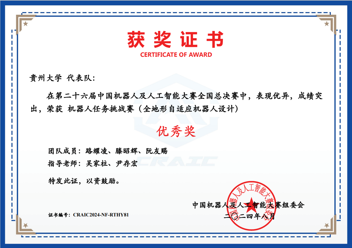 7 | 機(jī)器人任務(wù)挑戰(zhàn)賽(全地形自適應(yīng)機(jī)器人設(shè)計(jì)) | CRAIC20249Y4HPBFI | 趙梓衡、滕勇軍、米小紅 | 全國(guó)三等獎(jiǎng) |