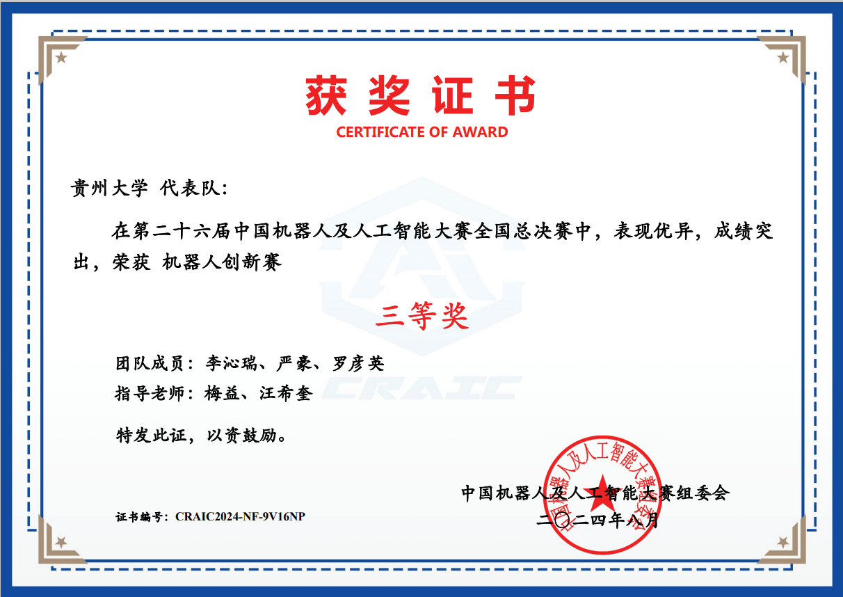 8 | 機(jī)器人創(chuàng)新賽 | CRAIC2024TVCKGBPC | 李沁瑞、嚴(yán)豪、羅彥英 | 全國(guó)三等獎(jiǎng) |