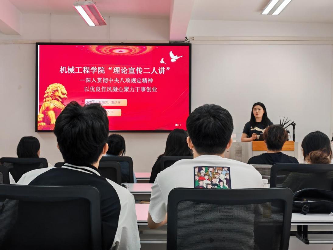 為深入貫徹中央八項(xiàng)規(guī)定精神學(xué)習(xí)教育,以優(yōu)良作風(fēng)凝心聚力、干事創(chuàng)業(yè)。5月 19日,機(jī)械工程學(xué)院本科生第三黨支部以中央八項(xiàng)規(guī)定為學(xué)習(xí)主題,開展“理論宣傳二人講”活動。
