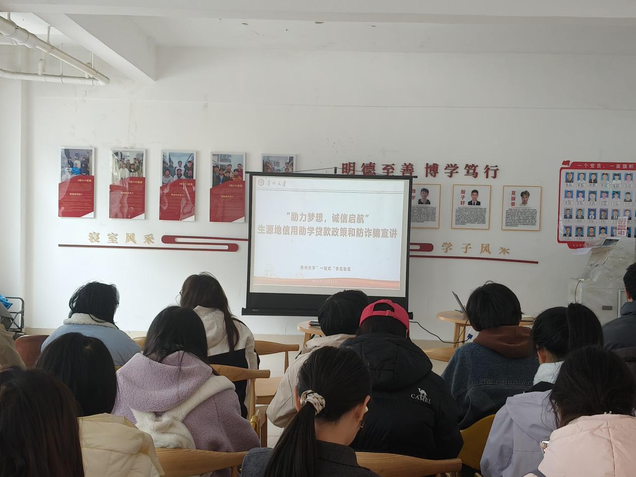 機械工程網(wǎng)站訊(文/楊朵圖/王則皓)為做好生源地信用助學貸款政策宣傳,增強學生誠信還貸與防詐騙意識,2025年11月20日中午,貴州大學機械工程學院聯(lián)合國家開發(fā)銀行貴州省分行、貴州大學學生資助管理中心在西一區(qū)6棟一樓大廳舉辦“一站式”學生社區(qū)之“助力夢想,誠信啟航”生源地信用助學貸款政策和防詐騙宣講會。國家開發(fā)銀行貴州省分行客戶三處三級經(jīng)理董婷婷主講,貴州大學學生資助管理中心副主任鄭嵐、機械工程學院黨委副書記廖燁、貴州大學學生資助管理中心相關(guān)科室負責人、機械工程學院輔導員代表與學生代表共40余人參與。