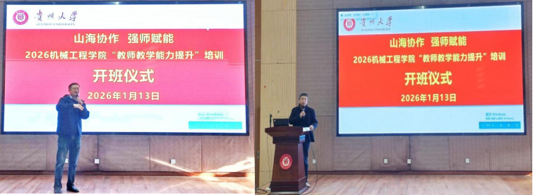 2026年1月13日上午,貴州大學機械工程學院教師教學能力提升培訓在圓形報告廳舉行開班儀式。本次培訓是學院貫徹落實學校教師隊伍建設、深化教育教學改革的重要舉措。也是貴州大學機械工程學院依托東西部高校協(xié)作平臺,引入優(yōu)質教學資源與先進理念,推動教師教學能力系統(tǒng)提升,支撐學院高質量內涵式發(fā)展實踐探索。